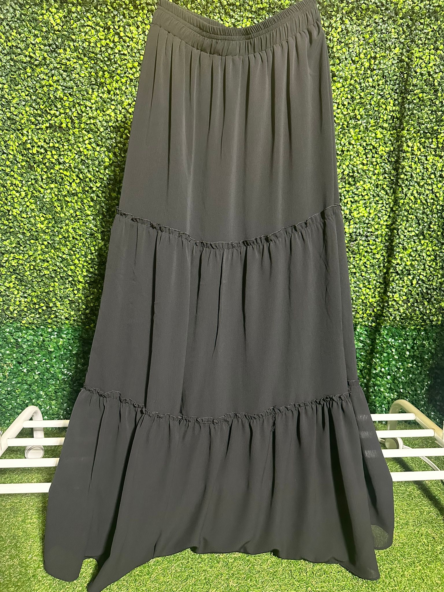 Introducing our Lara Long Tiered Black Skirt! With its playful tiers and edgy black color, this skirt is perfect for any occasion. Go beyond basic and add some quirk to your wardrobe with this must-have piece.
