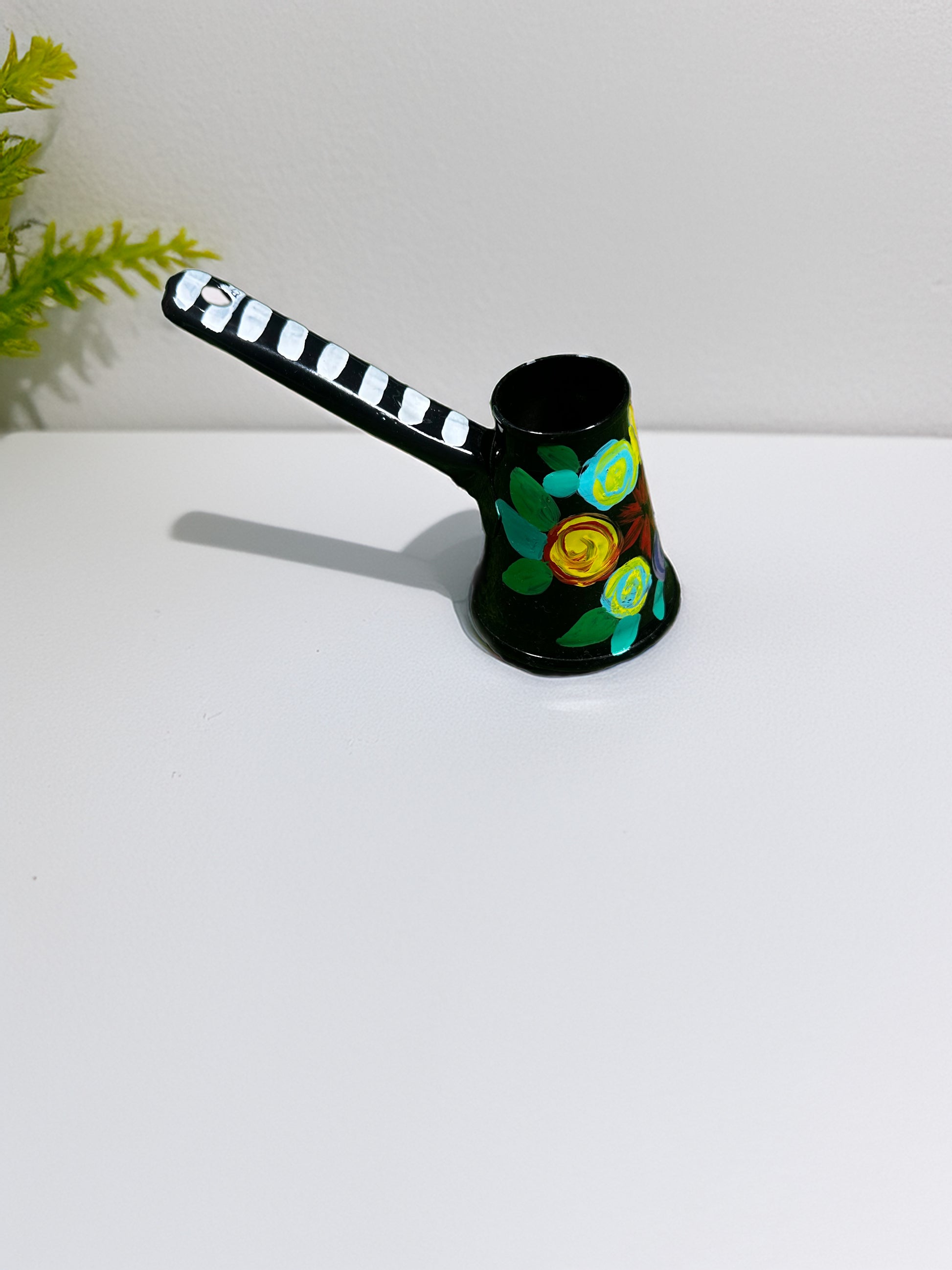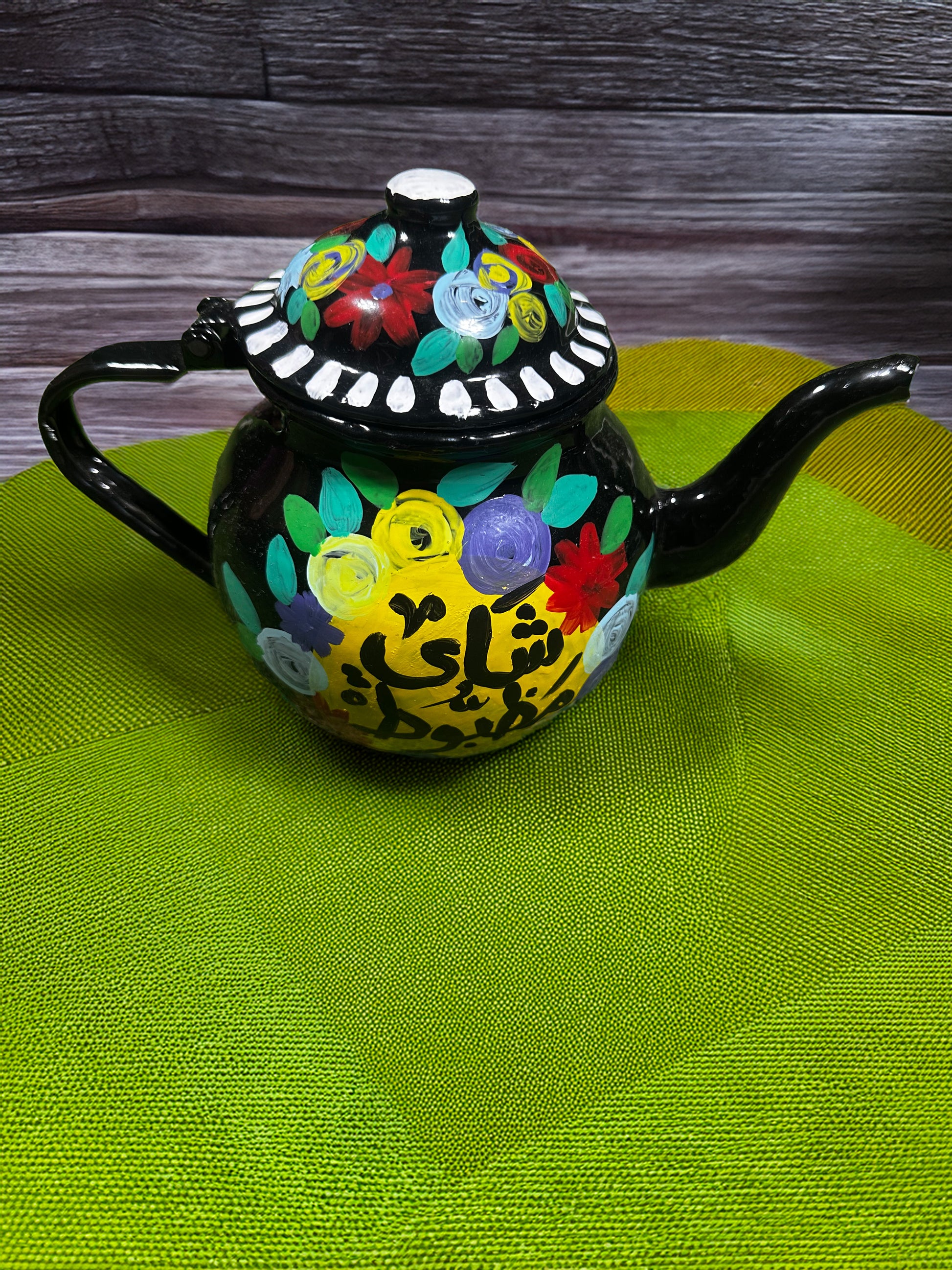- A black teapot adorned with vibrant floral patterns, including roses and intricate foliage.