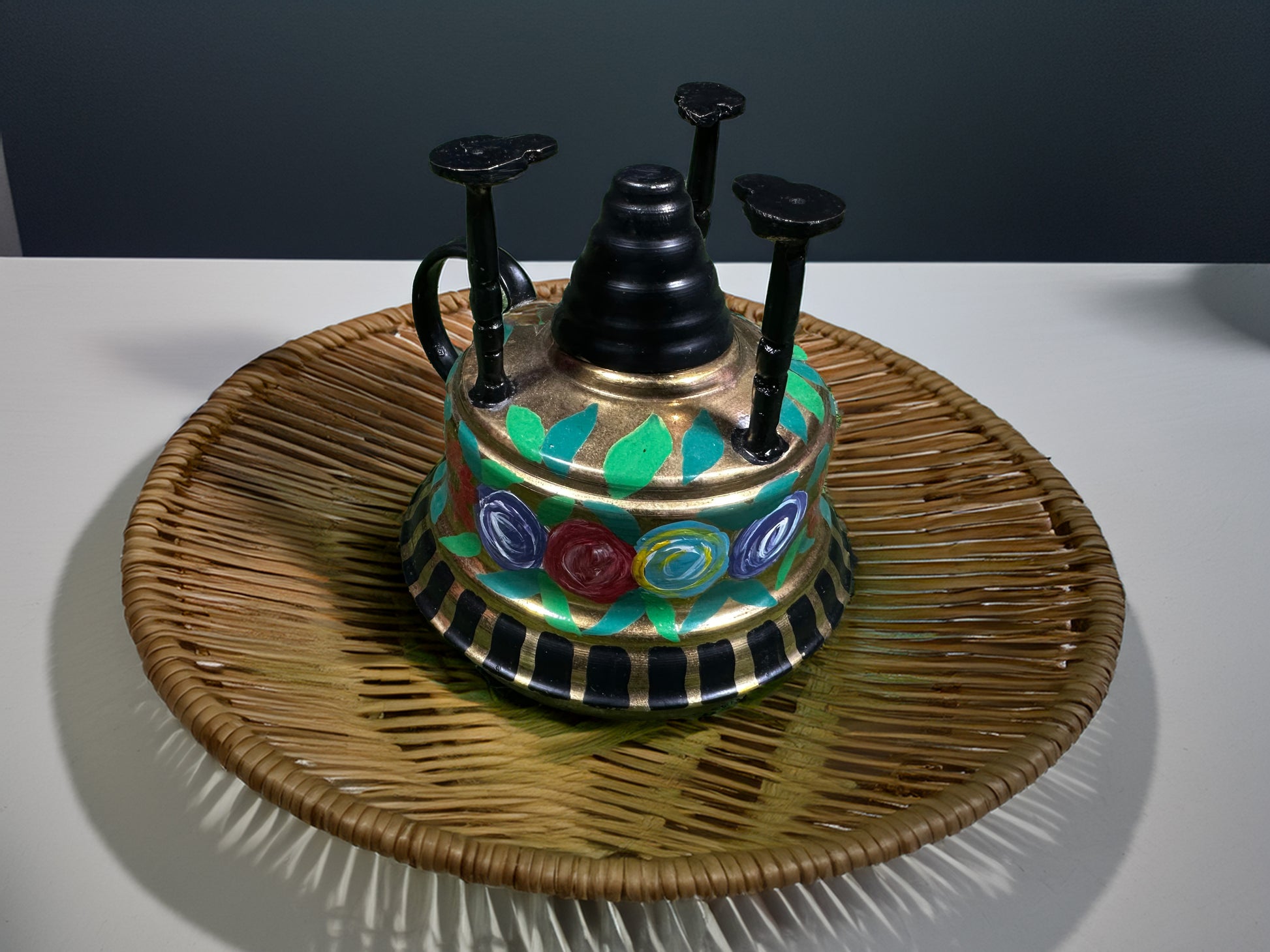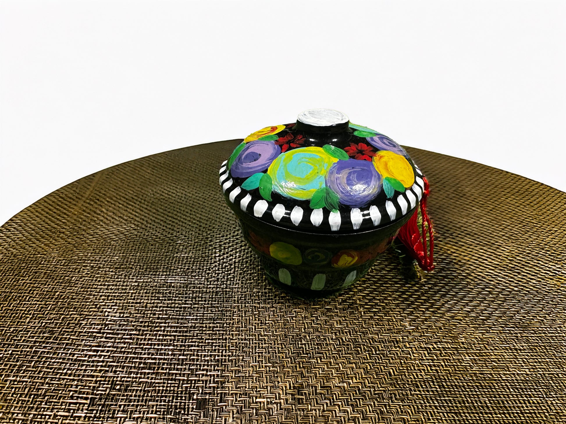 - A serving tray featuring woven edges and colorful hand-painted details.