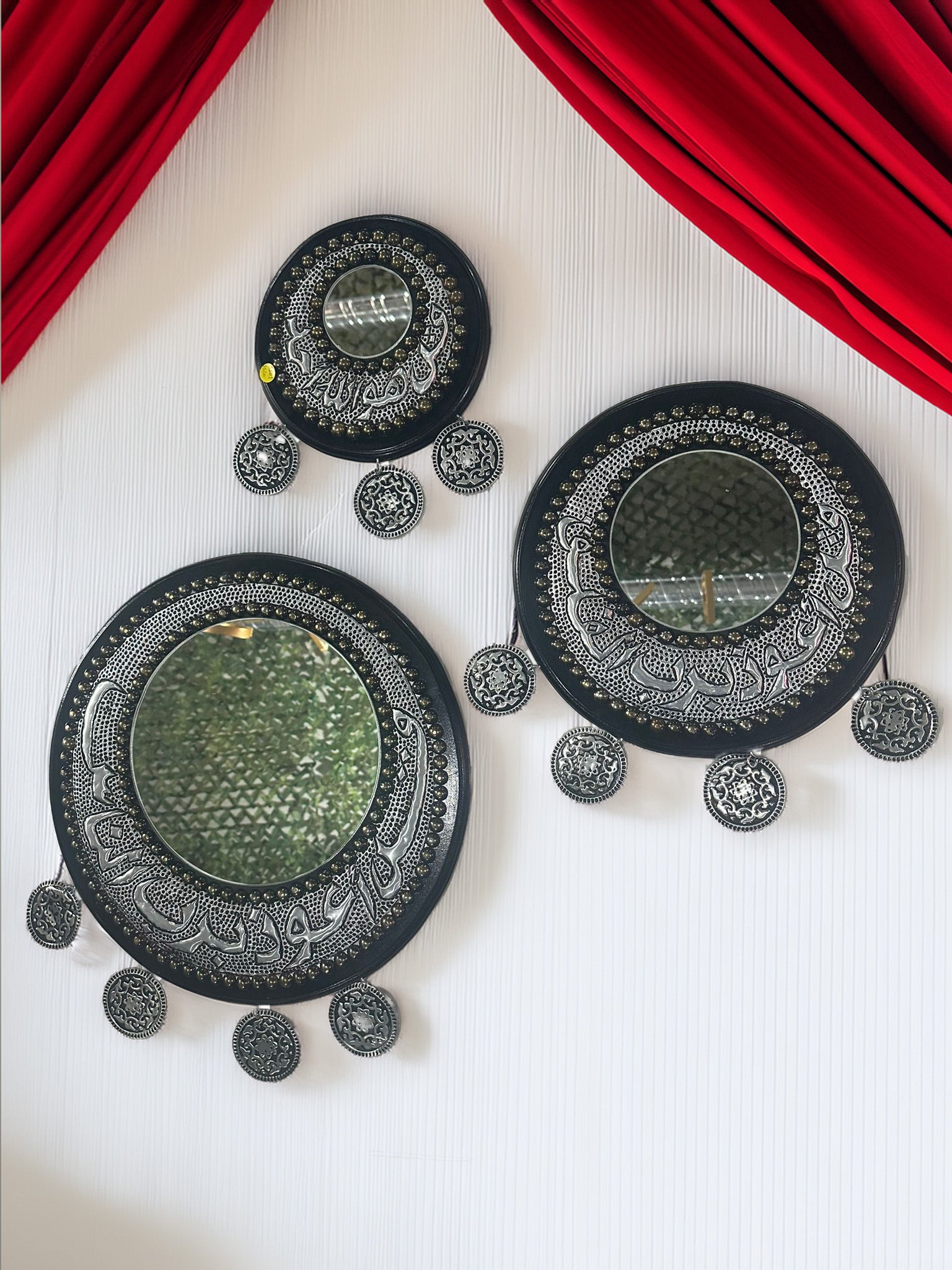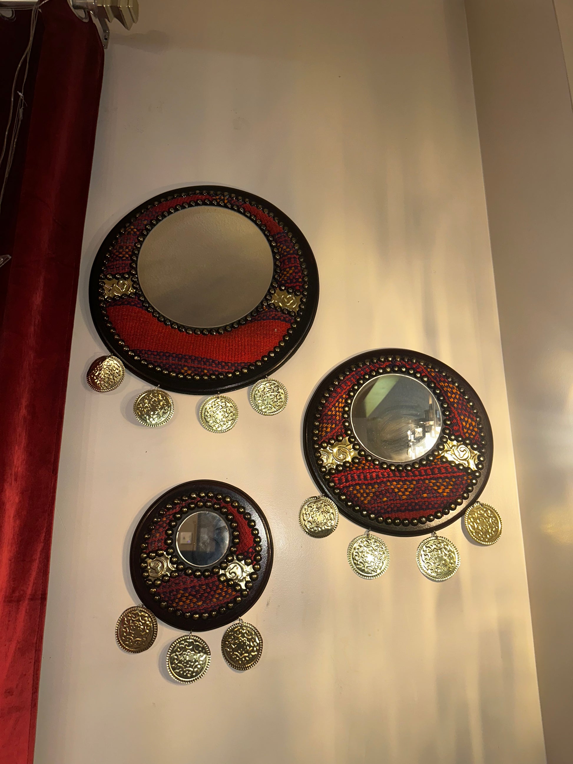 Elevate your decor with Oriental Home Decoration mirrors, featuring pleated Chiffon Scarves and a set of three mirrors in varying sizes. Crafted with wood and metal, these unique pieces add a touch of elegance to any space. A must-have for anyone looking to enhance their home's aesthetic.