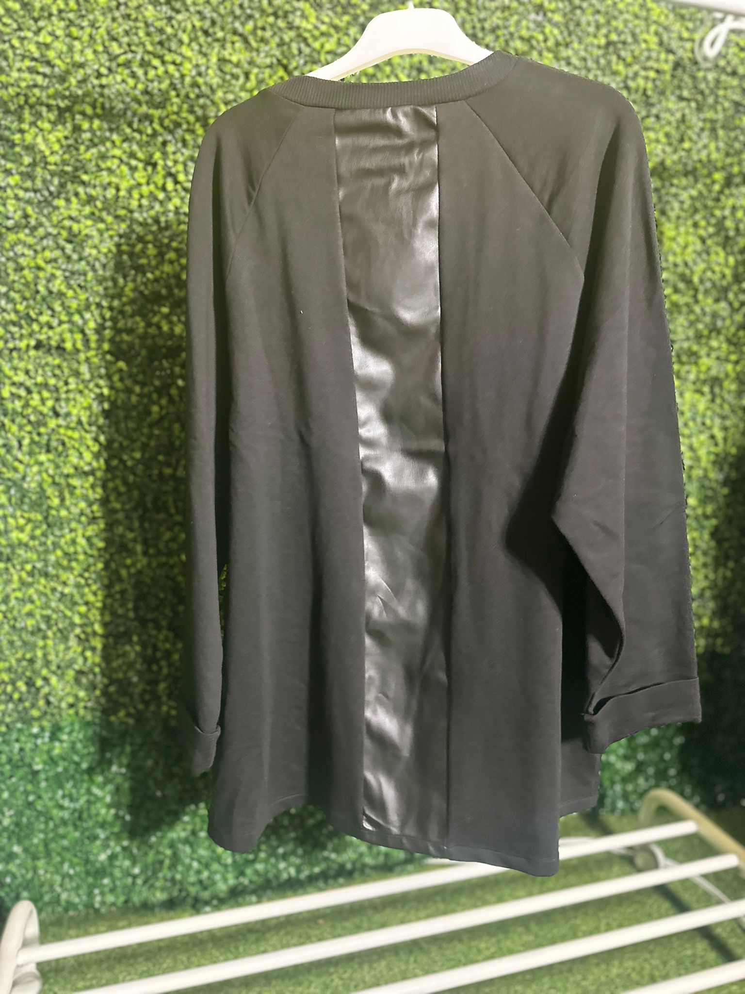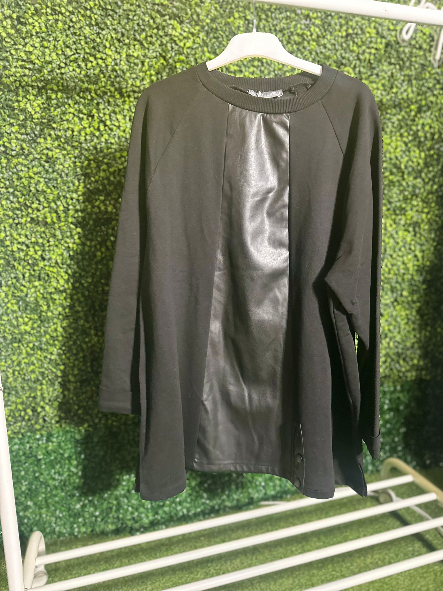 Stay cozy and stylish with the Abby Sweatshirt. Made with soft material, this sweatshirt features a unique design with leather accents and decorative buttons. Perfect for any casual outing, it's a must-have addition to your wardrobe.